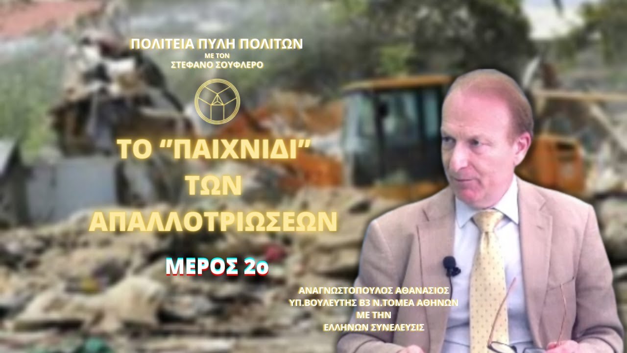 ΤΟΥΣ ΝΟΜΟΥΣ ΠΕΡΙ ΑΠΑΛΛΟΤΡΙΩΣΕΩΝ , ΑΝΑΛΥΕΙ Ο ΚΥΡΙΟΣ ΑΝΑΓΝΩΣΤΟΠΟΥΛΟΣ ΑΘΑΝΑΣΙΟΣ, ΥΠ. ΒΟΥΛΕΥΤΗΣ ΜΕ ΤΟΝ ΠΟΛΙΤΙΚΟ ΦΟΡΕΑ «ΕΛΛΗΝΩΝ ΣΥΝΕΛΕΥΣΙΣ» ΣΤΟΝ Β3΄ΝΟΤΙΟ ΤΟΜΕΑ ΑΘΗΝΩΝ, ΣΤΗΝ ΕΚΠΟΜΠΗ ¨ΠΟΛΙΤΕΙΑ ΠΥΛΗ ΠΟΛΙΤΩΝ¨ ΜΕ ΤΟΝ ΣΤΕΦΑΝΟ ΣΟΥΦΛΕΡΟ.
